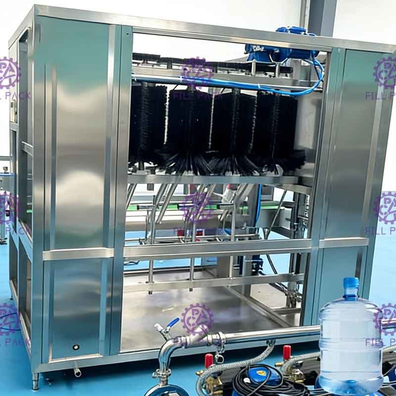 Maszyna do zewnętrznego szczotkowania i wewnętrznego płukania pod wysokim ciśnieniem jest przeznaczona do wydajnego wstępnego mycia butelek na wodę o pojemności 5 galonów i 20 litrów. Maszyna integruje obrotową szczotkę zewnętrzną z wewnętrznym płukaniem pod wysokim ciśnieniem, aby usunąć kurz, brud i pozostałe zanieczyszczenia zarówno z powierzchni, jak i wewnętrznej ściany beczki.